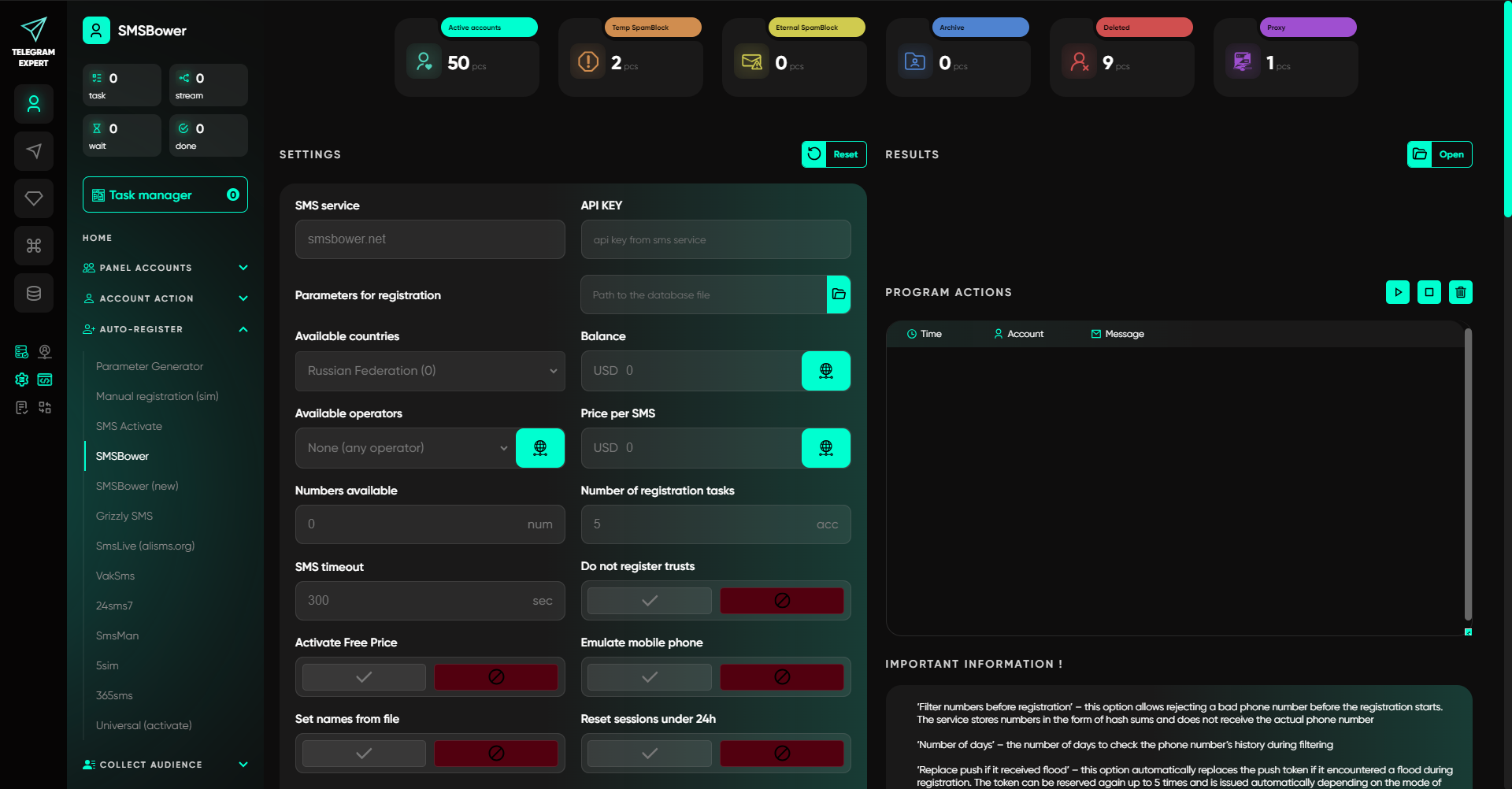 Génération de paramètres pour l'enregistrement de niveau de base et PRO, filtrage précis des numéros, toutes les méthodes disponibles de récupération de code, émulation d'appareil à 100% et accès à 10 meilleurs services SMS.