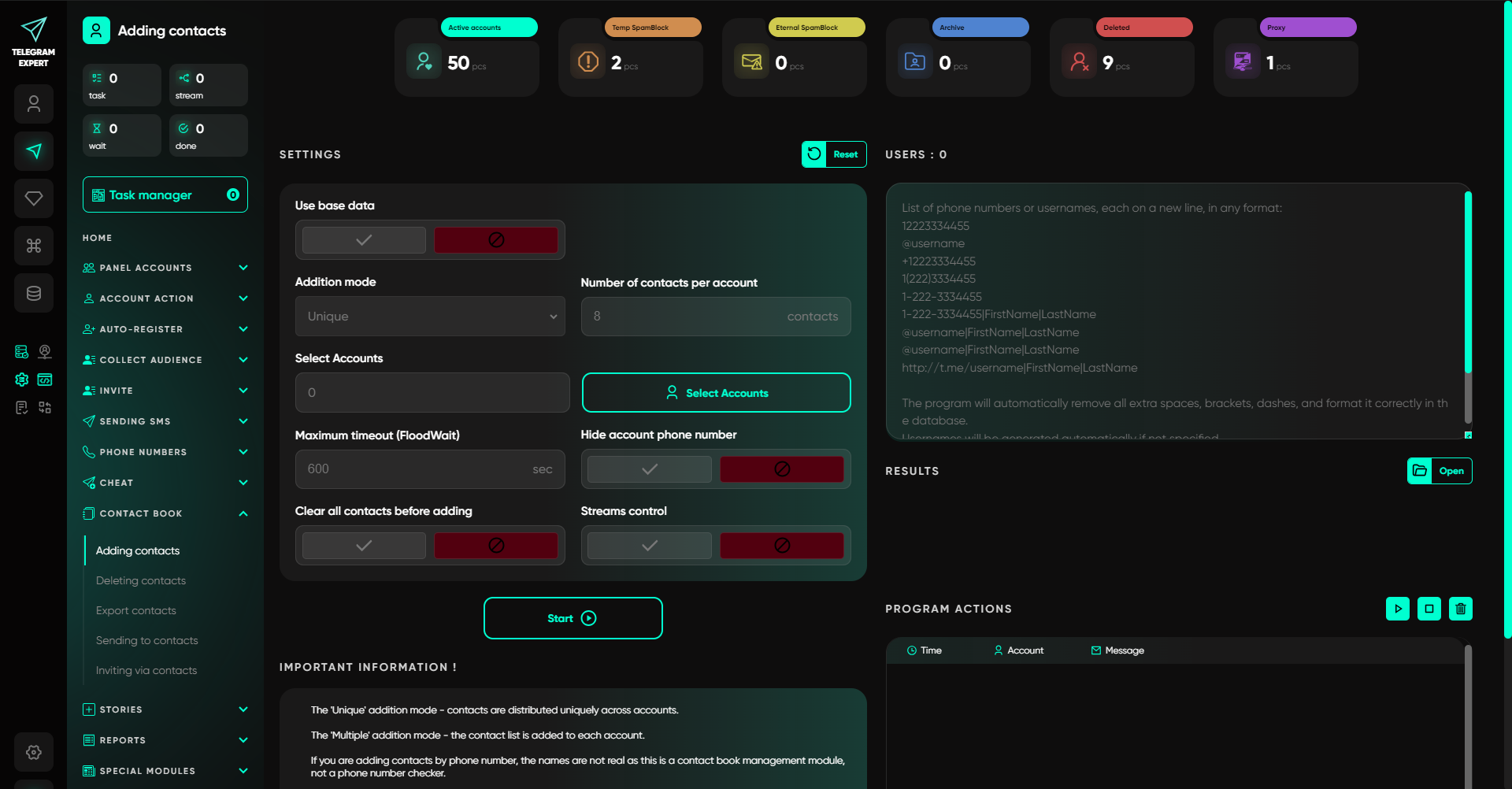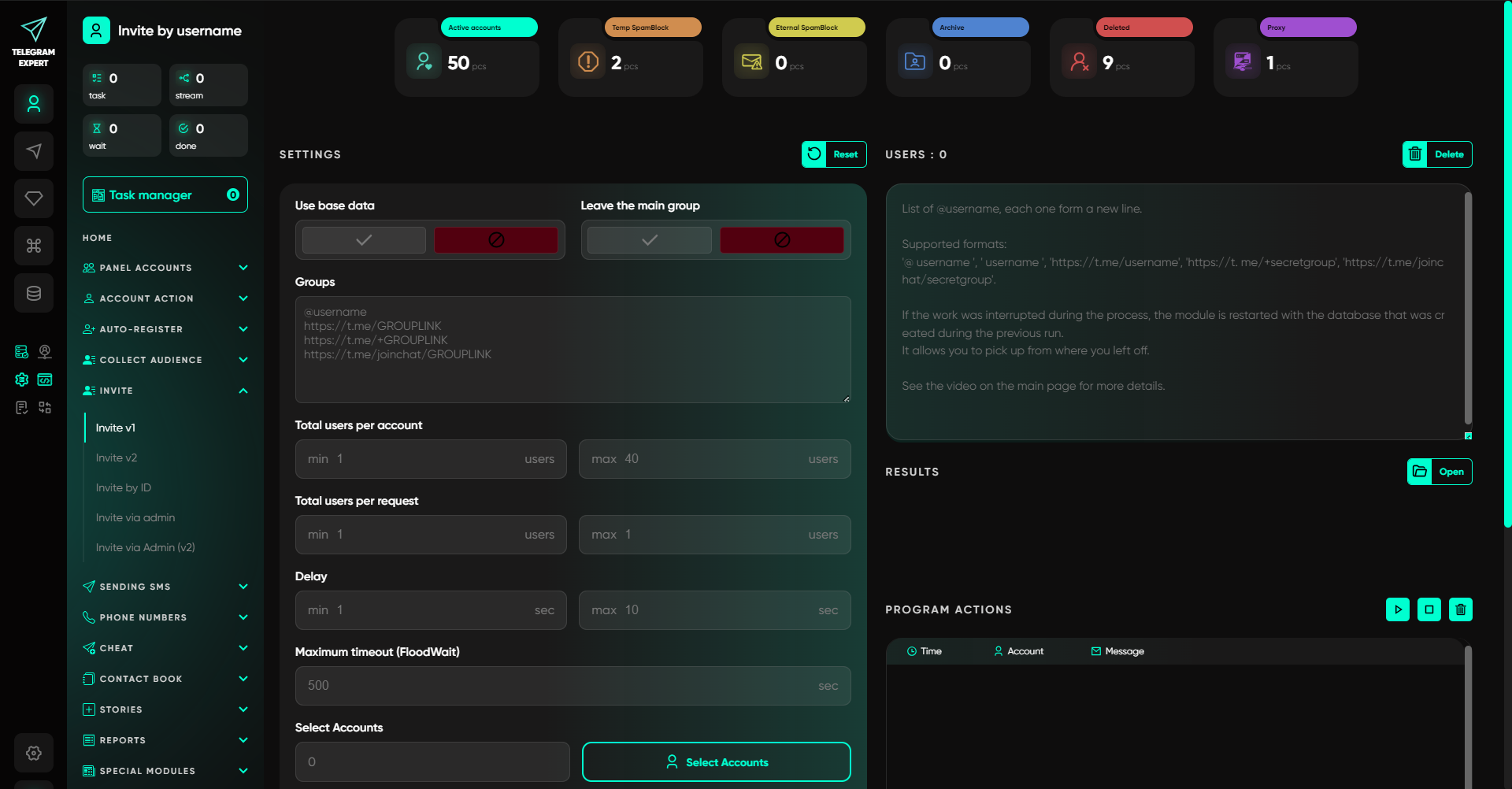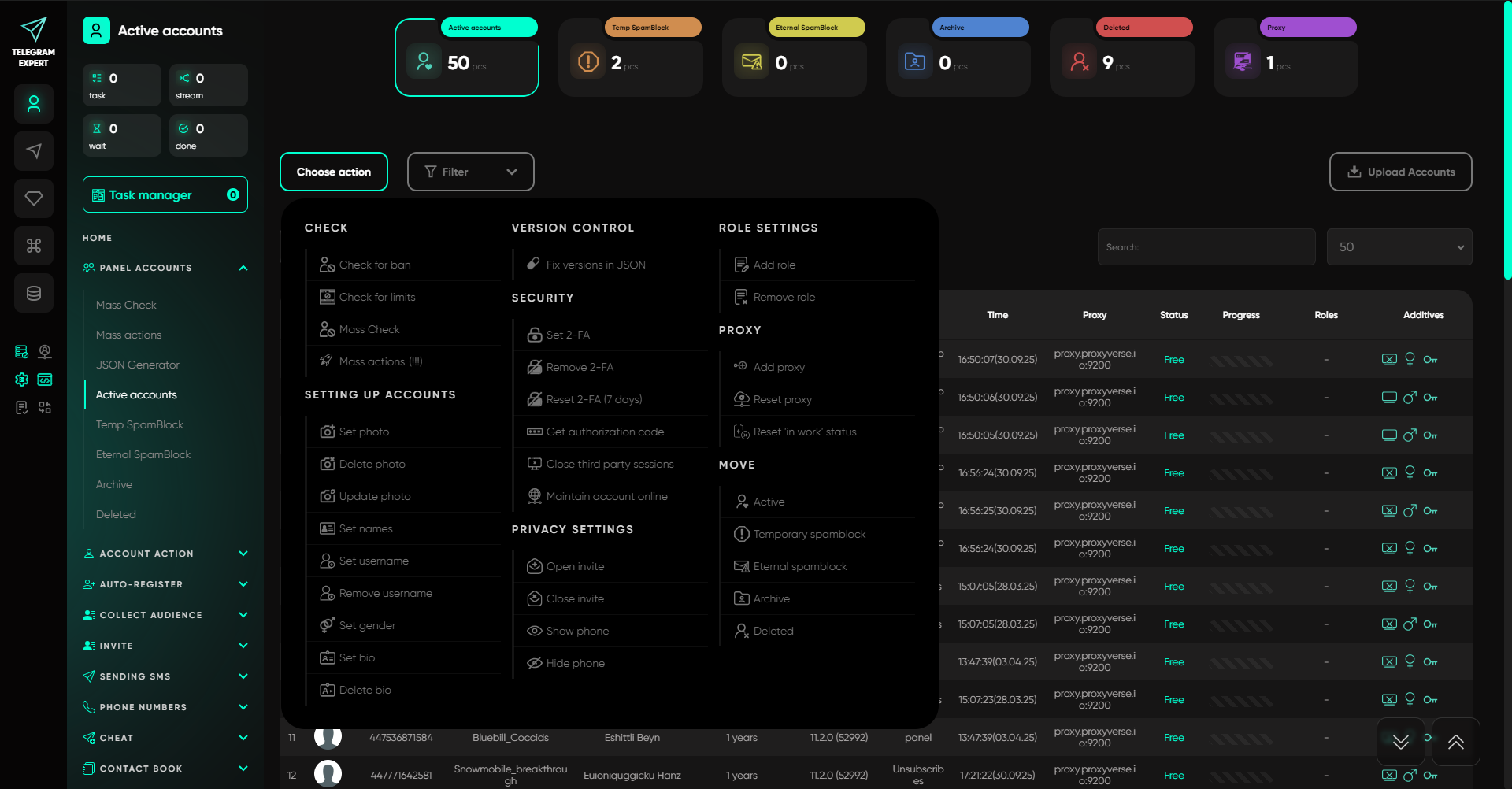 Possibilité de s'abonner en masse aux canaux et chats, de placer des réactions aux publications, d'augmenter le nombre de vues via des comptes ou des proxies et d'ajouter des référents aux bots.